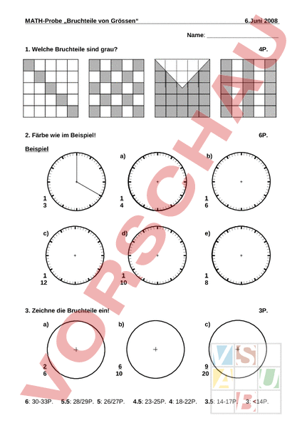 MATH-Probe „Bruchteile von Grössen 6.Juni 2008 Name: 1. Welche Bruchteile sind grau? 4P. 2. Färbe wie im Beispiel! 6P. Beispiel a) b) 1 3 1 4 1 6 c) d) e) 1 12 1 10 1 8 3. Zeichne die Bruchteile ein! a) 2 6 6: 30-33P. 3P. b) c) 6 10 9 20 5.5: 28/29P. 5: 26/27P. 4.5: 23-25P. 4: 18-22P. 3.5: 14-17P. 3: