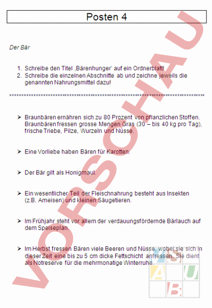 Posten 4 Der Bär 1. Schreibe den Titel ‚Bärenhunger auf ein Ordnerblatt! 2. Schreibe die einzelnen Abschnitte ab und zeichne jeweils die genannten Nahrungsmittel dazu! *********************************************************************************** Braunbären ernähren sich zu 80 Prozent von pflanzlichen Stoffen. Braunbären fressen grosse Mengen Gras (30 – bis 40 kg pro Tag), frische Triebe, Pilze, Wurzeln und Nüsse. Eine Vorliebe haben Bären für Karotten. Der Bär gilt als Honigmaul. Ein wesentlicher Teil der Fleischnahrung besteht aus Insekten (z.B. Ameisen) und kleinen Säugetieren. Im Frühjahr steht vor allem der verdauungsfördernde Bärlauch auf dem Speiseplan. Im Herbst fressen Bären viele Beeren und Nüsse, wobei sie sich in dieser Zeit eine bis zu 5 cm dicke Fettschicht anfressen. Sie dient als Notreserve für die mehrmonatige Winterruhe.