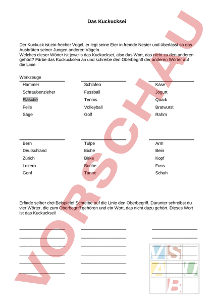 Das Kuckucksei Der Kuckuck ist ein frecher Vogel, er legt seine Eier in fremde Nester und überlässt so das Ausbrüten seiner Jungen anderen Vögeln. Welches dieser Wörter ist jeweils das Kuckucksei, also das Wort, das nicht zu den anderen gehört? Färbe das Kuckucksein an und schreibe den Oberbegriff der anderen Wörter auf die Linie. Werkzeuge Hammer Schlafen Käse Schraubenzieher Fussball Jogurt Flasche Tennis Quark Feile Volleyball Bratwurst Säge Golf Rahm Bern Tulpe Arm Deutschland Eiche Bein Zürich Birke Kopf Luzern Buche Fuss Genf Tanne Schuh Erfinde selber drei Beispiele! Schreibe auf die Linie den Oberbegriff. Darunter schreibst du vier Wörter, die zum Oberbegriff gehören und ein Wort, das nicht dazu gehört. Dieses Wort ist das Kuckucksei!