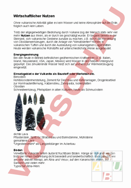 Wirtschaftlicher Nutzen Ohne vulkanische Aktivität gäbe es kein Wasser und keine Atmosphäre auf der Erde, folglich auch kein Leben. Trotz der allgegenwärtigen Bedrohung durch Vulkane zog der Mensch stets sehr viel mehr Nutzen aus ihnen, als er durch sie geschädigt wurde. Er begann bereits in der Steinzeit, sich vulkanische Gesteine zunutze zu machen, z.B. durch die Herstellung von Obsidianwerkzeugen, durch die Anlage von klimatisierten Höhlen in vulkanischen Tuffen und durch die Ausbeutung von vulkanogenen Lagerstätten. Heute werden vulkanische Rohstoffe auf unterschiedlichste Weise ausgebeutet. Energiegewinnung Bei den heute in Betrieb befindlichen geothermischen Kraftwerken (z. B. Italien, Island, Neuseeland, USA, Japan, Mexiko) wird Wasser in den heißen Untergrund gepumpt. Das zirkulierende Wasser heizt sich auf und wird zur Wärmeerzeugung eingesetzt. Einsatzgebiet der Vulkanite als Baustoff oder Werkstein etc. Bimsstein Hohlblocksteinherstellung, Zement für Deichbau und Hafenanlagen, Drogerieartikel zur Hornhautentfernung, Katzenstreu, Zahnpasta, Isolierplatten Obsidian Schneidwerkzeug, Pfeilspitzen in alten Kulturen; heute als Schmuckstein dichte Lava Pflasterstein, Splitt für Straßenbau und Bahndämme, Mühlsteine gemahlene Lava Urgesteinsmehl als Langzeitdünger im Ackerbau Böden Verwitterte Vulkanite liefern äußerst fruchtbare Böden. Hänge an Vulkanen werden trotz der hohen Gefährdung dicht besiedelt und landwirtschaftlich stark genutzt, wie am sehr aktiven Merapi, am Ätna und Vesuv, auf den Kanarischen Inseln, auf Santorin und vielen mehr. Typischer Ätna-Wein: Ackerbau am Merapi, Indonesien Kaffeeanbau auf fruchtbarer Vulkanerde in den Kordillerenzügen Südkolumbiens Terassierter Reisanbau auf fruchtbarer Vulkanerde Gesundheit und Tourismus Heiße Quellen, Schlammtöpfe und Geysire in Thermalgebieten sind magische Anziehungspunkte für Touristen. Heilquellen in weitgehend abgekühlten Thermalgebieten, wie sie für Deutschland typisch sind, liefern Mineralwässer, die Grundlage vieler Heilbäder und Sanatorien. Viele teils erloschene, teils schlafende, teils aktive Vulkane sind ein beliebtes Ziel für mehrere Hunderttausend Skifahrer, Abenteurer und Bergwanderer pro Jahr.