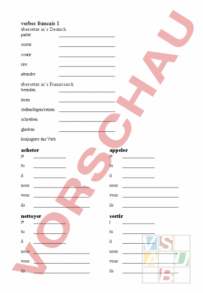 verbes francais 1 übersetze ins Deutsch parler ouvrir courir rire attendre übersetze ins Französisch beenden lesen stellen/legen/setzen schreiben glauben konjugiere das Verb acheter appeler je je tu tu il il nous nous vous vous ils ils nettoyer sortir je tu tu il il nous nous vous vous ils ils