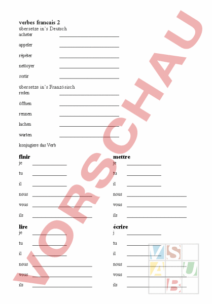 verbes francais 2 übersetze ins Deutsch acheter appeler répéter nettoyer sortir übersetze ins Französisch reden öffnen rennen lachen warten konjugiere das Verb finir mettre je je tu tu il il nous nous vous vous ils ils lire écrire je tu tu il il nous nous vous vous ils ils