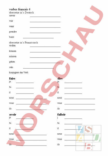 verbes francais 4 übersetze ins Deutsch savoir voir venir prendre boire übersetze ins Französisch wollen können müssen gehen sein konjugiere das Verb faire dire je je tu tu il il nous nous vous vous ils ils avoir falloir je tu tu il il nous nous vous vous ils ils