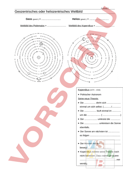 Gs/Entd.2 Geozentrisches oder heliozentrisches Weltbild Geos (griech.) Weltbild des Ptolemaios Helios (griech.) Weltbild des Kopernikus Kopernikus Ptolemaios(1473 (100––1543) 170 n. Chr.) Polnischer Ptolemaios Astronom fragte sich, wo die Seine neue Theorie: in der Nacht wohl sei? Warum der Die dreht sichmanchmal ., manchmal nur einmal um sich selbst. (/ und manchmal läuft .sichtbar Die . einmal im sei? um die . ) und schienen Der umkreist die . sich um die zu bewegen. Die . umkreisen die Sonne ebenfalls. Seine Theorie: Der am nächsten ist DieSonne ist im . esdes folgen Weltalls und . sich nicht. Der mit denkreisen UmHimmel die . der bewegt . dann die Planeten . und Kopernikus konnte Theorie noch . dann seine die. nicht beweisen. Dazu. waren genauere dann die Planeten not. und zu äusserst der wendig.