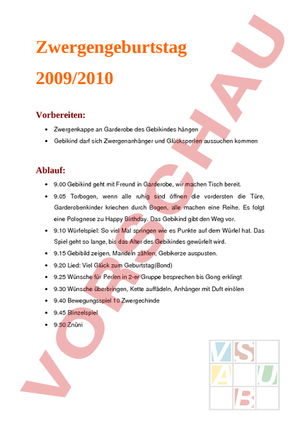 Zwergengeburtstag 2009/2010 Vorbereiten: • Zwergenkappe an Garderobe des Gebikindes hängen • Gebikind darf sich Zwergenanhänger und Glücksperlen aussuchen kommen Ablauf: • 9.00 Gebikind geht mit Freund in Garderobe, wir machen Tisch bereit. • 9.05 Torbogen, wenn alle ruhig sind öffnen die vordersten die Türe, Garderobenkinder kriechen durch Bogen, alle machen eine Reihe. Es folgt eine Polognese zu Happy Birthday. Das Gebikind gibt den Weg vor. • 9.10 Würfelspiel: So viel Mal springen wie es Punkte auf dem Würfel hat. Das Spiel geht so lange, bis das Alter des Gebikindes gewürfelt wird. • 9.15 Gebibild zeigen, Mandeln zählen, Gebikerze auspusten. • 9.20 Lied: Viel Glück zum Geburtstag(Bond) • 9.25 Wünsche für Perlen in 2er Gruppe besprechen bis Gong erklingt • 9.30 Wünsche überbringen, Kette auffädeln, Anhänger mit Duft einölen • 9.40 Bewegungsspiel 10 Zwergechinde • 9.45 Blinzelspiel • 9.50 Znüni