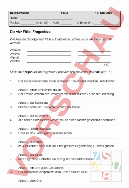 Erster Test zum Thema Fälle. Die Sch müssen vor allem die W-Fragen richtig stellen.