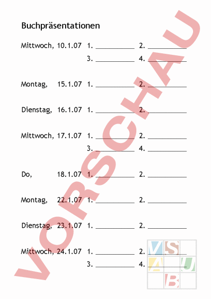 Buchpräsentationen Mittwoch, 10.1.07 1. 2. 3. 4. Montag, 15.1.07 1. 2. Dienstag, 16.1.07 1. 2. Mittwoch, 17.1.07 1. 2. 3. 4. Do, 18.1.07 1. 2. Montag, 22.1.07 1. 2. Dienstag, 23.1.07 1. 2. Mittwoch, 24.1.07 1. 2. 3. 4. Bewertungskriterien Sprichst du laut und deutlich? Sprichst du frei (ohne abzulesen)? Schaust du deinen MitschülerInnen beim Sprechen in die Augen? Erfährt man als ZuhörerIn, ob und warum dir das Buch gefallen oder nicht gefallen hat? Hast du das Buch kurz zusammengefasst? Zusatz: Hast du deine MitschülerInnen mit einem Quiz oder Rätsel geprüft? Bewertungskriterien Sprichst du laut und deutlich? Sprichst du frei (ohne abzulesen)? Schaust du deinen MitschülerInnen beim Sprechen in die Augen? Erfährt man als ZuhörerIn, ob und warum dir das Buch gefallen oder nicht gefallen hat? Hast du das Buch kurz zusammengefasst? Zusatz: Hast du deine MitschülerInnen mit einem Quiz oder Rätsel geprüft? Bewertungskriterien Sprichst du laut und deutlich? Sprichst du frei (ohne abzulesen)? Schaust du deinen MitschülerInnen beim Sprechen in die Augen? Erfährt man als ZuhörerIn, ob und warum dir das Buch gefallen oder nicht gefallen hat? Hast du das Buch kurz zusammengefasst? Zusatz: Hast du deine MitschülerInnen mit einem Quiz oder Rätsel geprüft?