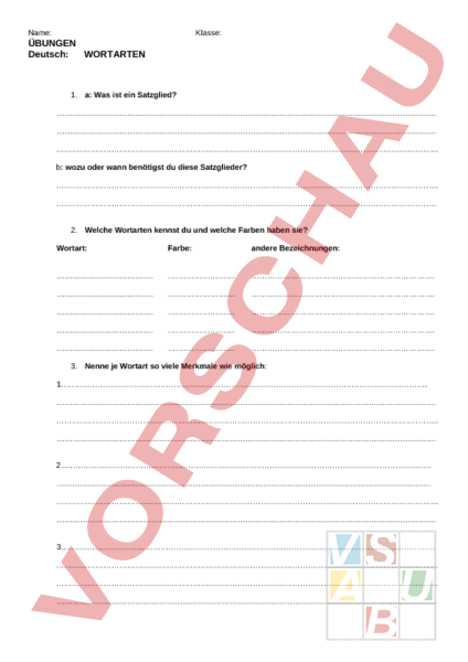 Name: Klasse: ÜBUNGEN Deutsch: WORTARTEN 1. a: Was ist ein Satzglied? . . b: wozu oder wann benötigst du diese Satzglieder? . 2. Welche Wortarten kennst du und welche Farben haben sie? Wortart: Farbe: andere Bezeichnungen: . . . . . . . . . . 3. Nenne je Wortart so viele Merkmale wie möglich: 1 . . 2 . 3 . 4 . 5 4. Welche Deklinationsgruppen unterscheidest du? (bsp.) 5. Übermale den Text mit den Farben der Wortarten. Eines Tages schlug der Affe sein Weibchen. Dieses lief zur Füchsin und klagte ihn traurig sein Leid. Die Füchsin sagte: „Tröste dich. Wir Frauen erhalten immer die Schläge, die unsere Männer verdienen.