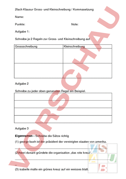 2fach Klausur Gross und Kleinschreibung Kommasetzung Name: Punkte: Note: Aufgabe 1: Schreibe je 2 Regeln zur Gross und Kleinschreibung auf. Grossschreibung Kleinschreibung Aufgabe 2 Schreibe zu jeder oben genannten Regel ein Beispiel. Aufgabe 3 Eigennamen Schreibe die Sätze richtig (1) george bush ist der präsident der vereinigten staaten von amerika. (2)henri dunant gründete die organisation „das rote kreuz. (3) isabelle malte ein grünes kreuz auf ein weisses blatt. (4) der rote platz ist ein berühmter platz in moskau. (5)in der stadt ist es schwierig, einen grünen platz zu finden. Anredepronomen Gross oder klein? Hallo Thomas, wie geht es (dir)? Guten Tag Frau Roth. Mir geht es blendend, ich fahre morgen mit meiner Freundin in den Urlaub. Und wie geht es (ihnen)? Mir geht es auch gut, von Ferien kann ich im Moment aber nur träumen. Was machen eigentlich (deine) Mutter und (dein) Vater? Ach, die arbeiten, wie immer. Wie geht es denn (ihrem) Sohn Ralf? Ralf macht ein Austauschjahr in Spanien. Also Thomas, bestelle (deiner) Familie liebe Grüsse von mir. Aufgabe 4 Der untenstehende Text ist in Kleinschreibung abgedruckt. Korrigiere den Text den Regeln entsprechend: Princess of pop immer wenn die experten das ende von britney spears ankündigten, erfolgte daraufhin ein neuer durchstart. ihr viertes album ist in den vereinigten staaten von amerika gar mit doppelplatin ausgezeichnet worden. britney war drei jahre alt, als ihr grosses idol madonna mit „holiday erstmals die hitparaden eroberte. jetzt liess es sich madonna nicht nehmen, im video zur groovigen single „me against the music von britney aufzutreten und ihr damit das bestmögliche gütesiegel zu verpassen. für ihre aktuelle tournee hat sich die schöne eine besonders verrückte show einfallen lassen: jeden abend wird sie auf der bühne das „onyx hotel einrichten. diese mysteriöse herberge lebt vom strom des onyx steines. hotelgäste, die in den stein blicken, sehen, wie ihre träume wirklichkeit werden. Aufgabe 5 Unterstreiche den Hauptsatz mit rot und den Nebensatz mit blau. Setze anschliessend die Kommas an der richtigen Stellen. 1. Heute hat unsere Lehrerin die wir sehr gerne haben gefehlt da sie krank war. 2. Wir haben uns schon auf dem Hof versammelt damit wir gemeinsam in die Klasse gehen können da ruft uns der Hilfslehrer in die Klasse. 3. Wir nennen ihn immer „Hühnerbrüh weil er immer zu uns sagt wir sollen ihm ihn die Augen sehen und in der Hühnerbrühe sind doch Augen. 4. Wir waren ziemlich sauer weil er Aufsicht hatte aber es war dann doch nicht so schlimm. 5. Als wir nämlich in der Klasse waren hat er zu uns gesagt: „Ich habe mit dem Herrn Rektor zu arbeiten. 6. Wir haben ihm versprochen artig zu sein obwohl wir eigentlich immer ziemlich artig sind. 7. Wenn wir in der Klasse Fussball spielen passen wir auf dass kein Fenster zu Bruch geht. 8. Falls wir uns mal kloppen müssen alle Brillenträger ihre Brille abnehmen damit sie sich nicht verletzen. 9. Herr Hühnerbrüh war trotzdem misstrauisch so dass er noch einmal zurückkam. Aufgabe 6 Komma bei Aufzählungen 2 Lies diesen Abschnitt durch und setzt anschliessend die Kommas. In der Tierhandlung Jaromir steht vor den grossen Käfigen und bewundert durch die Glasscheiben die Kanarienvögel Wellensittiche und Papageien. Das Pfeifen Schreien und Kreischen dieser Vögel ist so laut, dass er sich fast die Ohren zuhalten muss. Auf einer langen Holzstange sitzen verschiedenfarbige Wellensittiche: grüngelbe graublaue weisse und lilafarbene. Sie sitzen in engen regelmässigen Abständen nebeneinander. Andere baden hüpfen umher oder schlafen. Nun geht Jaromir zu den kleinen Käfigen, in denen sich muntere buntgefiederte Vögel befinden. Staunend liest er die seltsamen Namen: Schmetterlingsfinken Silberschnäbelchen Feuerweber Goldsperling Schönbürzelchen.