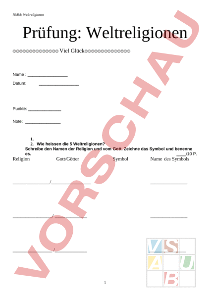 NMM: Weltreligionen Prüfung: Weltreligionen Viel Glück Name Datum: Punkte: Note: 1. 2. Wie heissen die 5 Weltreligionen? Schreibe den Namen der Religion und vom Gott. Zeichne das Symbol und benenne es. /10 P. Religion Gott/Götter Symbol Name des Symbols/ / / 1 / / 3. Kreuze die richtigen Aussagen an und korrigiere die falschen./14 P. Die Christen glauben an Shiva. Die Muslime feiern an Ostern die Auferstehung von Mohammed. Die Synagoge ist das Gotteshaus der Juden. Das Hinduismus entstand in Israel. Sidddhartha ist der Begründer des Buddhismus. Die Hindus glauben an mehrere Götter. Christen gehen in die Kirche und glauben an Gott. Jesus wurde um 570 in Mekka geboren. Das Alte Testament ist für Juden, Christen und Muslime wichtig. Das Zuckerfest feiern die Christen. NMM: Weltreligionen Das Kreuz ist ein wichtiger Gegenstand für Buddhisten. Allah, Gott und Jehova sind ein und dasselbe. Der Koran ist das heilige Buch der Christen. Die Hindus feiren das Lichterfest Divali. 4. Schreibe zu jedem Bild ein Satz. ** 2. 1. 3. 4. 5. 6. 7. 8. Beispiel 1. Jesus wächst in einer Grossfamilie auf. /7P. 2. 3. 4. 5. 6. 3 7. 8. Die Prüfung war: