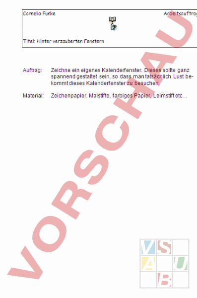 Cornelia Funke Arbeitsauftrag 3 Titel: Hinter verzauberten Fenstern Auftrag: Zeichne ein eigenes Kalenderfenster. Dieses sollte ganz spannend gestaltet sein, so dass man tatsächlich Lust bekommt dieses Kalenderfenster zu besuchen. Material: Zeichenpapier, Malstifte, farbiges Papier, Leimstift etc