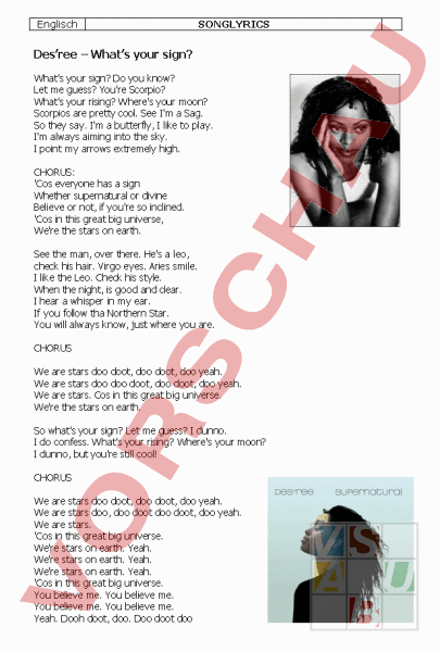Englisch SONGLYRICS Desree – Whats your sign? What your sign? Do you know? Let me guess? Youre Scorpio? What your rising? Where your moon? Scorpios are pretty cool. See Im Sag. So they say. Im butterfly, like to play. Im always aiming into the sky. point my arrows extremely high. CHORUS: Cos everyone has sign Whether supernatural or divine Believe or not, if youre so inclined. Cos in this great big universe, Were the stars on earth. See the man, over there. He leo, check his hair. Virgo eyes. Aries smile. like the Leo. Check his style. When the night, is good and clear. hear whisper in my ear. If you follow tha Northern Star. You will always know, just where you are. CHORUS We are stars doo doot, doo doot, doo yeah. We are stars doo doo doot, doo doot, doo yeah. We are stars. Cos in this great big universe. Were the stars on earth. So what your sign? Let me guess? dunno. do confess. What your rising? Where your moon? dunno, but youre still cool! CHORUS We are stars doo doot, doo doot, doo yeah. We are stars doo, doo doot doo doot, doo yeah. We are stars. Cos in this great big universe. Were stars on earth. Yeah. Were stars on earth. Yeah. Were stars on earth. Yeah. Cos in this great big universe. You believe me. You believe me. You believe me. You believe me. Yeah. Dooh doot, doo. Doo doot doo