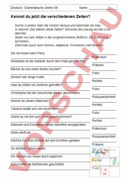 Deutsch: Grammatische Zeiten 09 Name. Kennst du jetzt die verschiedenen Zeiten? · · · · Suche in jedem Satz die Verben heraus und übermale sie blau. In welcher Zeit stehen diese Sätze? Schreibe die Lösung auf die Linie dahinter. Setze nun alle Sätze in die vorgeschriebene Zeitform. Du musst eng schreiben. Übermale auch noch Nomen, Adjektive, Pronomen und Partikeln. Sie verreisen nach Paris Sebastian ist als Indianer durch den Wald geschlichen. Bäckst du uns einen feinen Kuchen? Simeon war lange krank. Hast du mitten ins Zentrum getroffen? Christophe hat die Geschichte alleine geschrieben. Kennst du dieses Mädchen? Tamara kaufte sich ein neues Buch. Warst du mit ihm zum Floss geschwommen? Manuela und Eva haben heute Kartoffeln ausgegraben. Kilian pfeift ab. Martina hat ihren Bruder auf den Schlitten geladen. Du streitest schon wieder. Wir werden ein neues Buch beginnen. Adina hatte die Bettdecken geschüttelt. Präteritum Präsens Futur Perfekt Futur Plusquamperfekt Perfekt Futur Perfekt Präteritum Plusquamperfekt Präsens Präteritum Perfekt Futur Der Vater hat Dino schon zweimal gerufen. Lizabeta hatte die ganze Klasse eingeladen. In den Skiferien verreisen sie nach Zermatt. Warst du schon einmal auf dem Eiffelturm? Der Coiffeur wird Michèle die Haare schneiden. Danilo reitet über Stock und Stein. Ihr habt euch nicht sauber gewaschen. Cornelia war überglücklich Ratheeban wird den Salat nicht mögen. Der Räuber hat den Kaufmann überfallen. Janina hatte ein Geräusch gehört und war erschrocken. Elira hat Hunger. Natascha hat ihre kleine Schwester Zohra mitgenommen. Wenn Fabian Angst hat, pfeift er im Dunkeln. Laura pfeift ein Lied vor sich hin. Die Sonne schien den ganzen Tag. Julian hat Socken gestrickt. Raphael war auf dem Gipfel angekommen Morgen wird Marc auf einen Baum klettern Präteritum Präsens Futur Perfekt Plusquamperfekt Präteritum Präsens Perfekt Plusquamperfekt Präteritum 2x Präteritum Perfekt Futur Präteritum Perfekt Plusquamperfekt Futur Präteritum Präsens