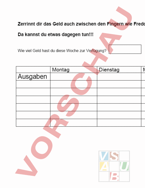 Zerrinnt dir das Geld auch zwischen den Fingern wie Freddy? Da kannst du etwas dagegen tun!!! Wie viel Geld hast du diese Woche zur Verfügung? Montag Ausgaben Dienstag Mittwoch Donnerstag