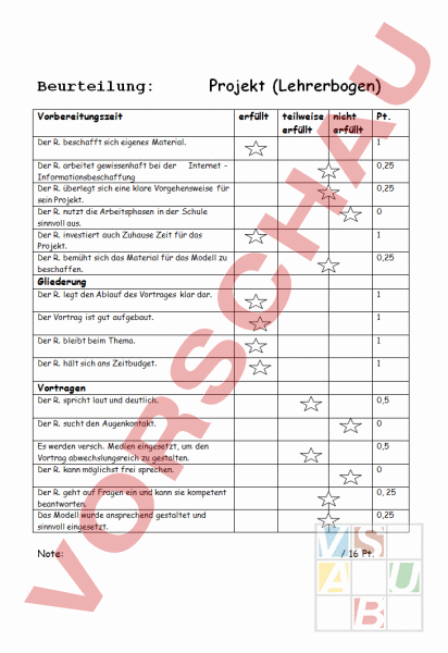 Beurteilung: Projekt (Lehrerbogen) Vorbereitungszeit erfüllt teilweise erfüllt nicht erfüllt Pt. Der R. beschafft sich eigenes Material. 1 Der R. arbeitet gewissenhaft bei der Internet Informationsbeschaffung Der R. überlegt sich eine klare Vorgehensweise für sein Projekt. Der R. nutzt die Arbeitsphasen in der Schule sinnvoll aus. Der R. investiert auch Zuhause Zeit für das Projekt. Der R. bemüht sich das Material für das Modell zu beschaffen. 0,25 0,25 0 1 0,25 Gliederung Der R. legt den Ablauf des Vortrages klar dar. 1 Der Vortrag ist gut aufgebaut. 1 Der R. bleibt beim Thema. 1 Der R. hält sich ans Zeitbudget. 1 Vortragen Der R. spricht laut und deutlich. 0,5 Der R. sucht den Augenkontakt. 0 Es werden versch. Medien eingesetzt, um den Vortrag abwechslungsreich zu gestalten. Der R. kann möglichst frei sprechen. 0,5 0 Der R. geht auf Fragen ein und kann sie kompetent beantworten. Das Modell wurde ansprechend gestaltet und sinnvoll eingesetzt. Note: 0, 25 0,25 16 Pt. Beurteilung: Projekt (Schülerbogen) Vorbereitungszeit Ich habe mir eigenes Material gesucht und in die Schule mitgebracht. Ich habe bei der Internet – Informationsbeschaffung gewissenhaft mitgearbeitet. Ich habe mir eine klare Vorgehensweise für das Projekt überlegt. Ich habe die Arbeitsphasen in der Schule sinnvoll ausgenutzt. Ich habe auch Zuhause Zeit für das Projekt investiert. Ich habe mich bemüht das Material für das Modell zu beschaffen. Gliederung Ich habe den Ablauf des Vortrages klar dargelegt. Ich blieb beim Thema. Ich habe das vorgegebene Zeitbudget eingehalten. Vortragen Ich habe versch. Medien eingesetzt, um den Vortrag abwechslungsreich zu gestalten. Ich konnte frei sprechen. Ich konnte auf Fragen eingehen und sie kompetent beantworten. Ich habe das Modell ansprechend gestaltet und es sinnvoll eingesetzt. Meine Bemerkungen: erfüllt teilweise erfüllt nicht erfüllt Pt.