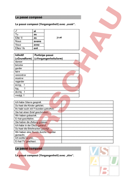 Le passé composé Le passé composé (Vergangenheit) avec „avoir. Tu Elle/ Il Nous Vous Elles/ Ils ai as as avons avez ont Infinitif (Grundform) Participe passé (Vergangenheitsform) joué danser bricoler garder faire rencontrer montrer regarder écrire lire dormir vouloir Ich habe Gitarre gespielt. Du hast die Kinder gehütet. Ihr habt euch mit Freunden getroffen. Sie hat einen Brief geschrieben. Wir haben gebastelt. Er hat geschlafen. Sie haben die Zeitung gelesen. Ich habe in der Disco getanzt. Du hast die Briefmarken gezeigt. Wir haben eine Runde durchs Quartier gemacht. Ich wollte tanzen. Er hat TV geschaut. Le passé composé Le passé composé (Vergangenheit) avec „étre. Je Tu Elle/ Il Nous Vous Elles/ Ils Infinitif (Grundform) aller rester descendre monter entrer partir sortir suis es est somme étes sont resté(e) au lit resté(e)s au lit Participe passé (Vergangenheitsform) Ich bin ins Kino gegangen. Du bist bis um 10 Uhr im Bett geblieben. Ihr seid an einen Fussballmatch gegangen. Wir sind an die Briefmarkenbörse gegangen. Sie sind im Kino geblieben. Er ist in die Disco gegangen. Ich bin hinaufgestiegen. Wir sind hinuntergestiegen. Du bist eingetreten. Sie ist weggefahren. Ihr seid hinausgegangen.