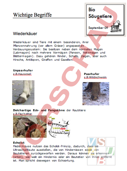 Bio Säugetiere Wichtige Begriffe September 09 Wiederkäuer Wiederkäuer sind Tiere mit einem besonderen, ihrer Pflanzennahrung (vor allem Gräser) angepassten Verdauungssystem: Sie besitzen neben dem normalen Magen (Labmagen) noch mehrere Vormägen (Pansen, Netzmagen und Blättermagen). Dazu gehören Rinder, Schafe, Ziegen, aber auch Hirsche, Antilopen, Giraffen und Gazellen. Unpaarhufer z.B.Hausesel Paarhufer z.B.Wildschwein Dolchartige Eck- und Fangzähne der Raubtiere z.B.Fischotter Echolot Fledermäuse nutzen das Echolot-Prinzip, dadurch, dass sie Ultraschalllaute ausstoßen, die von Hindernissen sowie von Beutetieren zurückgeworfen werden. Daraus können sie erkennen (orten), wie weit ein Hindernis oder ein Beutetier von ihnen entfernt ist. Man spricht deswegen von Echoortung.