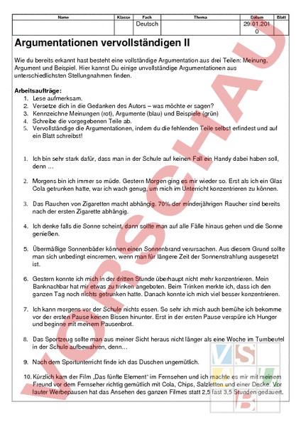 Name Klasse Fach Thema Deutsch Datum Blatt 29.01.201 0 Argumentationen vervollständigen II Wie du bereits erkannt hast besteht eine vollständige Argumentation aus drei Teilen: Meinung, Argument und Beispiel. Hier kannst Du einige unvollständige Argumentationen aus unterschiedlichsten Stellungnahmen finden. Arbeitsaufträge: 1. Lese aufmerksam. 2. Versetze dich in die Gedanken des Autors – was möchte er sagen? 3. Kennzeichne Meinungen (rot), Argumente (blau) und Beispiele (grün) 4. Schreibe die vorgegebenen Teile ab. 5. Vervollständige die Argumentationen, indem du die fehlenden Teile selbst erfindest und auf ein Blatt schreibst! 1. Ich bin sehr stark dafür, dass man in der Schule auf keinen Fall ein Handy dabei haben soll, denn 2. Morgens bin ich immer so müde. Gestern Morgen ging es mir wieder so. Erst als ich ein Glas Cola getrunken hatte, war ich wach genug, um mich im Unterricht konzentrieren zu können. 3. Das Rauchen von Zigaretten macht abhängig. 70% der minderjährigen Raucher sind bereits nach der ersten Zigarette abhängig. 4. Ich denke falls die Sonne scheint, dann sollte man auf alle Fälle hinaus gehen und die Sonne genießen. 5. Übermäßige Sonnenbäder können einen Sonnenbrand verursachen. Aus diesem Grund sollte man sich unbedingt eincremen, wenn man für längere Zeit der Sonnenstrahlung ausgesetzt ist. 6. Gestern konnte ich mich in der dritten Stunde überhaupt nicht mehr konzentrieren. Mein Banknachbar hat mir etwas zu trinken angeboten. Beim Trinken merkte ich, dass ich den ganzen Tag noch nichts getrunken hatte. Danach konnte ich mich viel besser konzentrieren. 7. Ich kann morgens vor der Schule nichts essen. So sehr ich mich auch bemühe ich bekomme vor der ersten Pause keinen Bissen hinunter. Erst in der ersten Pause verspüre ich Hunger und beginne mit meinem Pausenbrot. 8. Das Sportzeug sollte man aus meiner Sicht heraus nicht länger als eine Woche im Turnbeutel in der Schule aufbewahren, denn 9. Nach dem Sportunterricht finde ich das Duschen ungemütlich. 10. Kürzlich kam der Film „Das fünfte Element im Fernsehen und ich machte es mir mit meinem Freund vor dem Fernseher richtig gemütlich mit Cola, Chips, Salzletten und einer Decke. Vor lauter Werbepausen hat das Ansehen des ganzen Filmes statt 2,5 fast 3,5 Stunden gedauert.