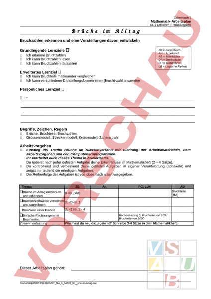 Zahlenbuch 5 Mathematik-Arbeitsplan ca. 5 Lektionen Hausaufgaben Brüche im Alltag Bruchzahlen erkennen und eine Vorstellungen davon entwickeln Grundlegende Lernziele € ZB Zahlenbuch AH Arbeitsheft AB Arbeitsblatt DS Denkschule BR Blitzrechnen LR Logische Reihen Ich erkenne Bruchzahlen Ich kann Bruchzahlen lesen Ich kann Bruchzahlen darstellen € € € Erweitertes Lernziel € Ich kann Bruchteile miteinander vergleichen Ich kann verschiedene Darstellungsformen einer (Bruch)-zahl anwenden € € Persönliches Lernziel € € Begriffe, Zeichen, Regeln Brüche, Bruchteile, Bruchzahlen Grössenmodell, Streckenmodell, Kreismodell, Zahlenstrahl € € Arbeitsvorgehen Einstieg ins Thema Brüche im Klassenverband mit Sichtung der Arbeitsmaterialien, dem Arbeitsvorgehen und den Computerlernprogrammen. Ihr erarbeitet euch dieses Thema in Zweierteams. Du notierst nach jeder gelösten Aufgabe deine Erkenntnisse im Mathematikheft (2 – 4 Sätze). Du kontrollierst und verbesserst deine gelösten Aufgaben in eigener Verantwortung (abhäkeln) und zeigst mir laufend die erledigten Aufgaben. Die Reihenfolge der Aufgaben ist von oben nach unten vorgegeben. € € € € € Thema ZB Brüche im Alltag entdecken und erkennen. € Bruchschreibweise verstehen S. 40 Nr. 1 und umrechnen. S. 41 Nr. 2 4 Bruchteile einer Einheit € € PC, LÜK 40 (Bild) € Einfache Rechnungen mit Bruchteilen. Zusammenfassung AH AB Bruchteile (HA) Rechentraining 5, Bruchteile von 100 Bruchteile von 1000 Was hast du neu dazu gelernt? Schreibe 3-4 Sätze in dein Mathematikheft. Dieser Arbeitsplan gehört: /home/bildpf/UMT/201002/UMT_MA_5_54378_Brche-im-Alltag.doc
