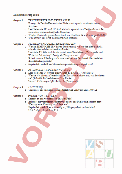 Zusammenfassung Textil Gruppe 1 TEXTILE KETTE UND TEXTILKAUF Erzeugt die Textile Kette mit den Bildern und sprecht zu den einzelnen Schritten Lest Seiten die 111 und 115 im Lehrbuch, sprecht zum Textilverbrauch der Deutschen und nennt mögliche Ursachen Welche Merkmale spielen beim Kauf von Textilien für dich eine große Rolle? Was passiert mit nicht mehr benötigten Textilien Gruppe 2 TEXTILIEN UND DEREN EIGENSCHAFTEN Welche EIGENSCHFTEN haben Textilien und wie werden sie eingeteilt, schreibt dies auf das vorbereitete Papier! Lest Seite 93! Wie hoch ist der Anteil von Chemiefasern, Baumwolle und Wolle bei Bekleidung? Fertigt ein Diagramm an! Schaut in eurer Kleidung nach. Aus welchen textilen Rohstoffen bestehen deine Kleidungsstücke! Begründet, weshalb die Chemiefaserproduktion gesteigert wird! o o Gruppe 3 BAUMWOLLE UND DEREN NUTZUNG Lest die Seiten 94-95 und beantwortet die Fragen 1-3 auf Seite 94 Welche Verfahren zu Veredelung der Baumwolle gibt es und was bewirken sie? (Schreibt die Verfahren auf das Papier) Nennt 10 Nutzungsmöglichkeiten der Baumwolle Gruppe 4 LEVI STRAUß Verwendet das vorliegende Arbeitsblatt und Lehrbuch Seite 100/101 Gruppe 5 o o PFLEGE VON TEXTILEN Sprecht zu den vorliegenden Thesen (Folie) Zeichnet die wichtigsten Pflegesymbole auf das Papier und sprecht dazu Was sagt eure Kleidung zur Pflege aus? Begründet, weshalb es notwendig ist, Pflegesymbole zu beachten? Löst Aufgabe 3 auf Seite 116