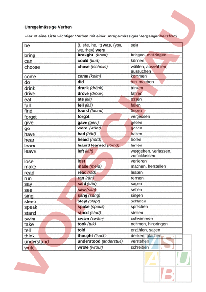 Unregelmässige Verben Hier ist eine Liste wichtiger Verben mit einer unregelmässigen Vergangenheitsform. bring can choose (I, she, he, it) was, (you, we, they) were brought (broot) could (kud) chose (tschous) come do drink drive eat fall find forget give go have hear learn leave came (keim) did drank (dränk) drove (drouv) ate (eit) fell (fäll) found (faund) forgot gave (geiv) went (wänt) had (häd) heard (hörd) learnt/ learned (lörnd) left (läft) lose make read run say see sing sleep speak stand swim take tell think understand write lost made (meid) read (räd) ran (rän) said (säd) saw (saa) sang (säng) slept (släpt) spoke (spouk) stood (stud) swam (swäm) took (tuk) told thought (‘soot) understood (anderstud) wrote (wrout) be sein bringen, mitbringen können wählen, auswählen, aussuchen kommen tun, machen trinken fahren essen fallen finden vergessen geben gehen haben hören lernen weggehen, verlassen, zurücklassen verlieren machen, herstellen lessen rennen sagen sehen singen schlafen sprechen stehen schwimmen nehmen, hinbringen erzählen, sagen denken, glauben verstehen schreiben