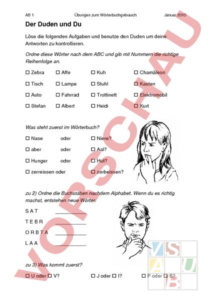 AB 1 Übungen zum Wörterbuchgebrauch Januar 2010 Der Duden und Du Löse die folgenden Aufgaben und benutze den Duden um deine Antworten zu kontrollieren. Ordne diese Wörter nach dem ABC und gib mit Nummern die richtige Reihenfolge an. Zebra Affe Kuh Chamäleon Tisch Lampe Stuhl Kasten Auto Fahrrad Trottinett Elektromobil Stefan Albert Heidi Kurt Was steht zuerst im Wörterbuch? Nase oder Niere? aber oder Aal? Hunger oder Hut? zerreissen oder zerbeissen? zu 2) Ordne die Buchstaben nachdem Alphabet. Wenn du es richtig machst, entstehen neue Wörter. SAT TEBR ORBTA LAA zu 3) Was kommt zuerst? oder V? oder I? oder B? AB 1 Übungen zum Wörterbuchgebrauch oder O? oder Y? Januar 2010 oder T? Zu 5, 6 und 7) Partnerarbeit Ihr arbeitet zu zweit. Jeder schreibt sich fünf Wörter auf einen Zettel. Auf einen anderen Zettel schreibt ihr die Wörter in alphabetischer Reihenfolge. Achte darauf, dass dein Partner diesen Zettel nicht sieht. Wenn das beide gemacht haben, tauscht ihr die Zettel und versucht die Wörter so schnell wie möglich alphabetisch zu nummerieren. Wer ist zuerst fertig? Hinweis: Es wird schwieriger wenn möglichst viele Anfangsbuchstaben gleich sind. (Bsp.: Olive, Oliver, Olivia, Olivgrün) Zu 8 und 9) Setze ‚der‘, ‚die‘ oder ‚das‘ ein. Käfig Ort Ball Butter Reis Zehe Wappen Scheitel Sand Lineal Spitze Magnet