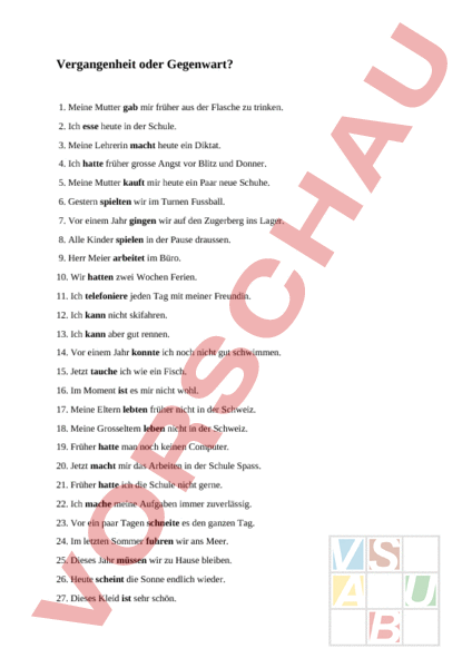 Vergangenheit oder Gegenwart? 1. Meine Mutter gab mir früher aus der Flasche zu trinken. 2. Ich esse heute in der Schule. 3. Meine Lehrerin macht heute ein Diktat. 4. Ich hatte früher grosse Angst vor Blitz und Donner. 5. Meine Mutter kauft mir heute ein Paar neue Schuhe. 6. Gestern spielten wir im Turnen Fussball. 7. Vor einem Jahr gingen wir auf den Zugerberg ins Lager. 8. Alle Kinder spielen in der Pause draussen. 9. Herr Meier arbeitet im Büro. 10. Wir hatten zwei Wochen Ferien. 11. Ich telefoniere jeden Tag mit meiner Freundin. 12. Ich kann nicht skifahren. 13. Ich kann aber gut rennen. 14. Vor einem Jahr konnte ich noch nicht gut schwimmen. 15. Jetzt tauche ich wie ein Fisch. 16. Im Moment ist es mir nicht wohl. 17. Meine Eltern lebten früher nicht in der Schweiz. 18. Meine Grosseltern leben nicht in der Schweiz. 19. Früher hatte man noch keinen Computer. 20. Jetzt macht mir das Arbeiten in der Schule Spass. 21. Früher hatte ich die Schule nicht gerne. 22. Ich mache meine Aufgaben immer zuverlässig. 23. Vor ein paar Tagen schneite es den ganzen Tag. 24. Im letzten Sommer fuhren wir ans Meer. 25. Dieses Jahr müssen wir zu Hause bleiben. 26. Heute scheint die Sonne endlich wieder. 27. Dieses Kleid ist sehr schön.