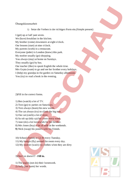 Übungsklassenarbeit 1) Setze die Verben in der richtigen Form ein.(Simple present) (get) up at half past seven. We (have) breakfast in the kitchen. My brother (come) downstairs at eight oclock. Our lessons (start) at nine oclock. My parents (work) in restaurant. Everyone (jeder) in London (know) this park. My mother usually (go) shopping. You always (stay) at home on Sundays. They usually (go) by bus. Our teacher (like) to speak English the whole time. Mrs Gupta (want) to go and see her brother every holidays. (help) my grandpa in the garden on Saturday afternoons. You (try) to read book in the evening. 2)Fill in the correct forms. 1) Ben (watch) lot of TV. 2) Tom (go) to parties on Saturdays. 3) Tom always (learn) his new words. 4) The cat always (try) to climb the big tree. 5) Our cat (catch) lot of mice. 6) Sa rah up (tidy up) her room every week. 7) Jane (do) lot homework for her brother. 8) Mrs Jones (buy) lot of milk at the weekends. 99) Nick (swap) his posters with his friends. 10) School (finish) at 12:30 every Tuesday. 11) My budgie (fly) around the room every day. 12) My mother (wash) my clothes when they are dirty 3)Dont or doesnt? Fill in. 1) The pupils (not do) their homework. 2) Sally (not learn) her words. 3) Nick and Tom (not listen) to their teachers. 4) Jack (not copy) the text on the board. 5) The girls (not write) into their exercise books. 6) Tim and Andrew (not clean) the board. 7) Laurie (not fetch) chalk for her teacher. 8) Mike and Ben (not answer) questions. 9) The boys (not tidy up) their desks. 10) Sandra (not read) the text for homework. 4)Bitte gib den Plural der Substantive ein! driver course fish host cage sheep woman child 5)Setze Singular oder Plural! We need to order lot of .(food/foods) The were analyzed yesterday. (datum/data) Do you know where my are? (key/keys) The soldiers refused to follow .(order/orders) Ink spilled all over the .(floor/floors) Is there more than one (definition/definitions) for this word. You can take the (stair/stairs)or an (elevator/elevators) to the fifth floor. wear glasses because contact (lense/lenses) hurt my (eye/eyes). 6)Vocabulary 1)Deine/ Großeltern /sind/ an der Spitze. 2)Mein/ Großvater/ ist gestorben. 3)Unsere/ Kinder /sind /drei/: zwei /Söhne/ eine/ Tochter./ 4)Und/ hier/ sind /Onkel /Harry/ und /Tante/ Emie. 5)Harry/ ist/ verheiratet/ mit/ Emie. 6)Kinder/ und /Eltern/, verheiratet/ oder/ geschieden/ oder/ ledig. 7)Eine /Familie/ ohne/ Mutter. 8)Ich /mache/ gerade /Hausaufgaben. 9) Der Mann/und/die/Frau /rennen weg 10) von /Jack Hudson /sehr/ interessant. 11)Am Morgen/ dusche/ ich. 12)Familien/ von/ anderen /Ländern. 13)Er /trägt/ eine/ Sonnenbrille. 14)Er/ schreibt/ uns/ eine/ Geschichte. 15)Sophie/ hört /den/ Wecker// am /Morgen. 16)Sie /sind /hungrig /und/ durstig. 17)Wir/ warten/ auf/ Jo. 18)Stell/ dir/ vor/ du /bist/ eine/ Katze. 20)Das/ Haus/ sieht/ anders/ aus. 21)Küche/Geschirrspüler/Schrank/Herd/Kühlschrank 22)Das/ Sofa/ ist/ gemütlich. 23)Danach/ tut /Lisa/ das/ Geschirr /in den/ Geschirrspüler. 24)Nach/ einer/ Stunde/ sind /sie /sauber. 25)Haha/ das/ ist/ lustig. 26)Mein/ Traumhaus/ist /kalt/ und /warm. Punkte: Note: