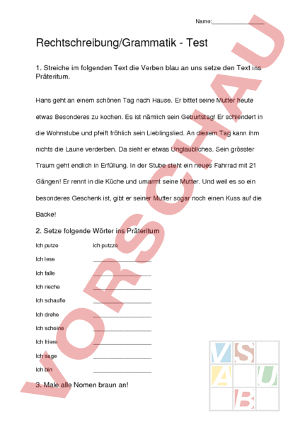 Name:_ Rechtschreibung/Grammatik Test 1. Streiche im folgenden Text die Verben blau an uns setze den Text ins Präteritum. Hans geht an einem schönen Tag nach Hause. Er bittet seine Mutter heute etwas Besonderes zu kochen. Es ist nämlich sein Geburtstag! Er schlendert in die Wohnstube und pfeift fröhlich sein Lieblingslied. An diesem Tag kann ihm nichts die Laune verderben. Da sieht er etwas Unglaubliches. Sein grösster Traum geht endlich in Erfüllung. In der Stube steht ein neues Fahrrad mit 21 Gängen! Er rennt in die Küche und umarmt seine Mutter. Und weil es so ein besonderes Geschenk ist, gibt er seiner Mutter sogar noch einen Kuss auf die Backe! 2. Setze folgende Wörter ins Präteritum Ich putze ich putzze Ich lese Ich falle Ich rieche Ich schaufle Ich drehe Ich scheine Ich friere Ich sage Ich bin 3. Male alle Nomen braun an! Name:_ Wir haben einen schönen hund. Es hat lange gedauert, bis ich merkte, dass er müde ist. Nicht immer arbeite ich gleich gut. Strichmännchen zeichne ich am liebsten! Am abend lerne ich weiter. Das ist das erste mal, das mir der lehrer das gesagt hat. Er turnt leidenschaftlich gern. Am computer kann man tolle sachen machen. Die grosse katze gehört mir. Das lernen fällt mir nicht schwer. In zürich hat mir mein vater ein geschenk gekauft. Im Kino muss man ruhig sein. Der beste witz des tages. 4. Setze die fehlenden Satzzeichen. An einem schönen Morgen ging ich auf eine Wanderung auf dem Gipfel wollte ich essen und mich ausruhen es war unglaublich schön denn es hatte keine einzige Wolke am Himmel ich fragte den Himmel warum kannst du nicht immer so schön sein als ich auf dem Heimweg war zogen ganz plötzlich dunkle Wolken auf ich schrie laut jetzt darf es auf keinen Fall regnen ich hatte nur ein Tshirt an ich wollte rennen aber mein Rucksack war noch zu schwer darin befand sich ein Klappstuhl eine Karte und noch ein halbes Brot das dachte ich zumindest als ich den Rucksack öffnete fand ich einen Regenschutz den ich wohl noch von der letzten Wanderung drin hatte mit meinem gelben Regenschutz lief ich gemütlich nach Hause Name:_ 5. oder v?orläufigerienerdienenroschatererdinandollerärgernorjammernierzigerkelünfzigernsehererliebt 6. viel oder fiel? Die Prüfung gut aus. Das Laub vom Baum. Das Mädchen unangenehm auf. Ich habe schon fallen gelassen. Das ist des Guten zu! Eine Zahl ver_fachen. Er um. 7. oder ie? fr_ren F_nger fl_gen wen_g n_cht B_ss verd_nt S_ben H_lfe Z_ge M_lch Reg_rung b_nden B_ldung bes_gt Fam_lie v_lleicht W_rkung w_hern z_mlich Br_f Name:_ 8. oder ck? zerdrü_en De_el Re_ord mer_würdig Glo_e Völ_erball Di_icht Spe_ viere_ig Ja_e Fran_en Kleiderha_en qua_en schlan_ Publi_um Vi_tor pau_en Schreibbloeins Scho_olade E_el Gau_ler Re_ An_er hei_el Schna_e Angeli_a 9. das oder dass? 1. Da ist Kind, ich gestern in Spreitenbach gesehen habe. 2. Ich weiß, er in Baden wohnt. 3. Im Fernsehen wurde berichtet, es iauf Haiti ein Erdbeben gegeben hat. 4. Haus, in dem Peter wohnt, gehörte früher Barack Obama. 5. Mir ist klar, dieser Satz richtig ist. 6. Dieses Game nehme ich nicht, ich nehme da! 7. du so müde bist, ist kein Wunder! 8. Ich habe geträumt, Fußballspiel in der Antarktis stattfindet.
