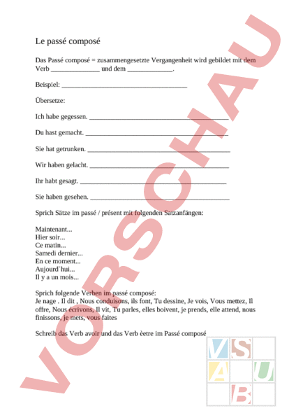 Le passé composé Das Passé composé zusammengesetzte Vergangenheit wird gebildet mit dem Verb und dem. Beispiel: Übersetze: Ich habe gegessen. Du hast gemacht. Sie hat getrunken. Wir haben gelacht. Ihr habt gesagt. Sie haben gesehen. Sprich Sätze im passé présent mit folgenden Satzanfängen: Maintenant. Hier soir. Ce matin. Samedi dernier. En ce moment. Aujourdhui. Il a un mois. Sprich folgende Verben im passé composé: Je nage Il dit Nous conduisons, ils font, Tu dessine, Je vois, Vous mettez, Il offre, Nous écrivons, Il vit, Tu parles, elles boivent, je prends, elle attend, nous finissons, je mets, vous faites Schreib das Verb avoir und das Verb èetre im Passé composé Schreib je zwei Sätze mit den Verneinungen im Passé composé ne. rien/plus/pas/jamais
