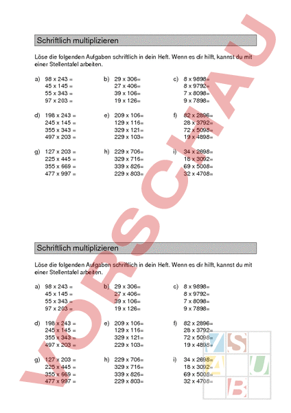 Schriftlich multiplizieren Löse die folgenden Aufgaben schriftlich in dein Heft. Wenn es dir hilft, kannst du mit einer Stellentafel arbeiten. a) 98 243 45 145 55 343 97 203 b) 29 306 27 406 39 106 19 126 c) 8 9898 8 9792 7 8098 9 7898 d) 198 243 245 145 355 343 497 203 e) 209 106 129 116 329 121 229 103 f) 82 2896 28 3792 72 5098 19 4898 g) 127 203 225 445 355 669 477 997 h) 229 706 329 716 339 826 229 803 i) 34 2698 18 3092 69 5008 32 4708 Schriftlich multiplizieren Löse die folgenden Aufgaben schriftlich in dein Heft. Wenn es dir hilft, kannst du mit einer Stellentafel arbeiten. a) 98 243 45 145 55 343 97 203 b) 29 306 27 406 39 106 19 126 c) 8 9898 8 9792 7 8098 9 7898 d) 198 243 245 145 355 343 497 203 e) 209 106 129 116 329 121 229 103 f) 82 2896 28 3792 72 5098 19 4898 g) 127 203 225 445 355 669 477 997 h) 229 706 329 716 339 826 229 803 i) 34 2698 18 3092 69 5008 32 4708