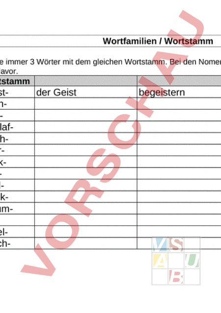 Wörter mit vorgegebenem Wortstamm suchen und in Tabelle eintragen.