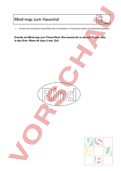 Mindmap zum Hausrind Moos Ich kann mein Vorwissen in einem Mindmap mit mindestens 10 Stichworten sauber und übersichtlich darstellen. Erstelle ein Mindmap zum Thema Rind. Was kommt dir zu diesem Thema alles in den Sinn. Nimm dir dazu 3 min. Zeit.