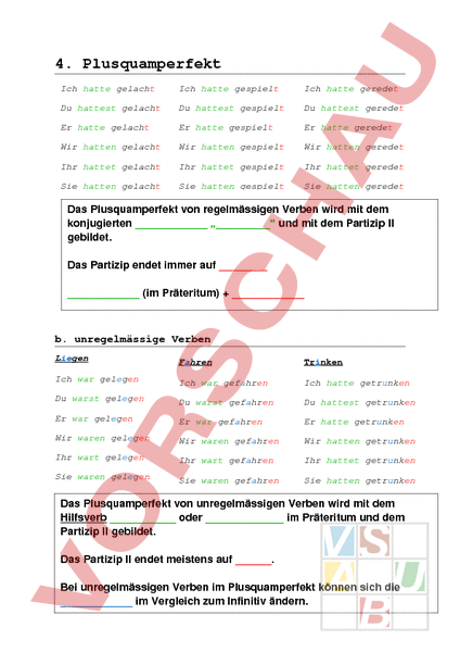 4. Plusquamperfekt Ich hatte gelacht Ich hatte gespielt Ich hatte geredet Du hattest gelacht Du hattest gespielt Du hattest geredet Er hatte gelacht Er hatte gespielt Er hatte geredet Wir hatten gelacht Wir hatten gespielt Wir hatten geredet Ihr hattet gelacht Ihr hattet gespielt Ihr hattet geredet Sie hatten gelacht Sie hatten gespielt Sie hatten geredet Das Plusquamperfekt von regelmässigen Verben wird mit dem konjugierten „_ und mit dem Partizip II gebildet. Das Partizip endet immer auf (im Präteritum) b. unregelmässige Verben Liegen Fahren Trinken Ich war gelegen Ich war gefahren Ich hatte getrunken Du warst gelegen Du warst gefahren Du hattest getrunken Er war gelegen Er war gefahren Er hatte getrunken Wir waren gelegen Wir waren gefahren Wir hatten getrunken Ihr wart gelegen Ihr wart gefahren Ihr hattet getrunken Sie waren gelegen Sie waren gefahren Sie hatten getrunken Das Plusquamperfekt von unregelmässigen Verben wird mit dem Hilfsverb oder im Präteritum und dem Partizip II gebildet. Das Partizip II endet meistens auf . Bei unregelmässigen Verben im Plusquamperfekt können sich die im Vergleich zum Infinitiv ändern.