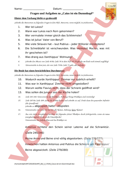 Name: Datum: Fragen und Aufgaben zu „Caius ist ein Dummkopf Hinter dem Vorhang bleibt es grabesstill Schreibe die Antworten zu folgenden Fragen in dein Heft. Antworte, wenn möglich, in Stichworten. 1. Wer ist Lukos? 2. Wann war Lukos nach Rom gekommen? 3. Wer vermutete immer gleich das Schlimmste? 4. Was ist Julius Vater von Beruf? 5. Wie viele Sklaven hat – laut Publius – jeder Millionär mindestens? 6. Die Schreibtafel ist verschwunden. Was vermutet Mucius, was mit ihr geschehen ist? 7. Was drang aus Xanthippus Wohnung? 8. Schreibe den Absatz von Zeile 44 bis Zeile 54 in dein Heft ab. Vergleiche am Ende noch einmal sorgfältig! 9. Unterstreiche in dem Satz, der von Zeile 70 bis Zeile 72 geht, alle Subjekte. Die Beule hat einen beträchtlichen Durchmesser Schreibe die Antworten zu folgenden Fragen in dein Heft. Antworte, wenn möglich, in Stichworten. 10. Wodurch wurde Xanthippus Zimmer nur spärlich erhellt? 11. Was war in Xanthippus Zimmer nicht umgestoßen? 12. Warum wollte Flavius nicht, dass der Schrank geöffnet wird? 13. Was sollen die Jungen aus der Küche holen? 14. Zeile 181184: Unterstreiche alle Prädikate. Achtung: Einige Prädikate sind zweiteilig! 15. Zeile 185 bis Zeile 189: Suche die Verben heraus und schreibe sie auf. Finde dazu den passenden Infinitiv (die Grundform). Schreibe so: abgespielt hatte abspielen 16. Unterstreiche von Zeile 211 bis 222 alle Nomen. Achtung: keine Namen! 17. Aus wie vielen Satzgliedern bestehen die folgenden Sätze? Markiere durch Schrägstriche, wenn ein neues Satzglied beginnt. Denk an die Umstellprobe! Unterstreiche das Subjekt blau und das Prädikat rot. Antonius richtete den Schein seiner Laterne auf die Schranktür. (Zeile 245/246) Meine Arme und Beine sind völlig abgestorben. (Zeile 276/277) Inzwischen hatten Antonius und Publius die Schnüre um Xanthippus Beine abgewickelt. (Zeile 279/280) /home/bildpf/UMT/201003/UMT_DE_5_57646_Caius-ist-ein-Dummkopf.doc