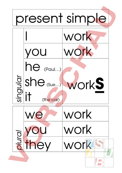 present simple you he she it we you they work work plural singular (Paul) (Sue) work (the car) work work work