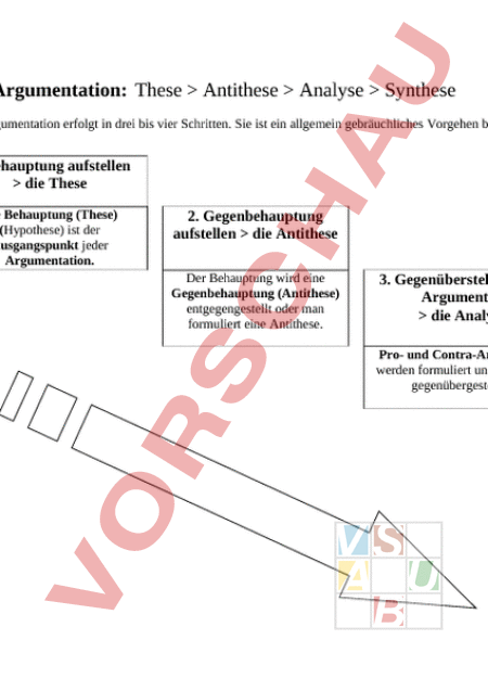 Die Argumentation: These Antithese Analyse Synthese Die Argumentation erfolgt in drei bis vier Schritten. Sie ist ein allgemein gebräuchliches Vorgehen bei Diskussionen mit verschiedenen Standpunkten. 1. Behauptung aufstellen die These Die Behauptung (These) (Hypothese) ist der Ausgangspunkt jeder Argumentation. 2. Gegenbehauptung aufstellen die Antithese Der Behauptung wird eine Gegenbehauptung (Antithese) entgegengestellt oder man formuliert eine Antithese. 3. Gegenüberstellung von Argumenten die Analyse Pro- und Contra-Argumente werden formuliert und einander gegenübergestellt. 4. Schlussfolgerung die Konklusion, Synthese Am Ende einer Argumentation steht die Schlussfolgerung (Konklusion oder Synthese) mit Akzeptanz oder Dissonanz in der Sache.