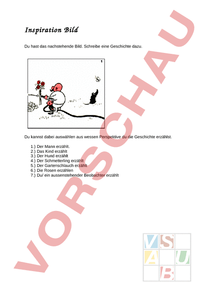 Inspiration Bild Du hast das nachstehende Bild. Schreibe eine Geschichte dazu. Du kannst dabei auswählen aus wessen Perspektive du die Geschichte erzählst. 1.) 2.) 3.) 4.) 5.) 6.) 7.) Der Mann erzählt. Das Kind erzählt Der Hund erzählt Der Schmetterling erzählt Der Gartenschlauch erzählt Die Rosen erzählen Du/ ein aussenstehender Beobachter erzählt