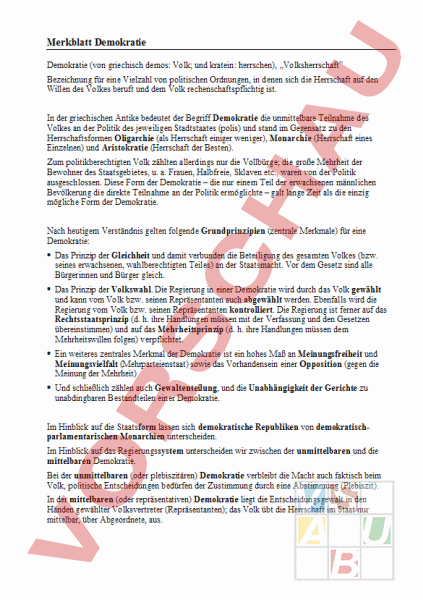 Merkblatt Demokratie Demokratie (von griechisch demos: Volk; und kratein: herrschen), „Volksherrschaft Bezeichnung für eine Vielzahl von politischen Ordnungen, in denen sich die Herrschaft auf den Willen des Volkes beruft und dem Volk rechenschaftspflichtig ist. In der griechischen Antike bedeutet der Begriff Demokratie die unmittelbare Teilnahme des Volkes an der Politik des jeweiligen Stadtstaates (polis) und stand im Gegensatz zu den Herrschaftsformen Oligarchie (als Herrschaft einiger weniger), Monarchie (Herrschaft eines Einzelnen) und Aristokratie (Herrschaft der Besten). Zum politikberechtigten Volk zählten allerdings nur die Vollbürge; die große Mehrheit der Bewohner des Staatsgebietes, u. a. Frauen, Halbfreie, Sklaven etc., waren von der Politik ausgeschlossen. Diese Form der Demokratie – die nur einem Teil der erwachsenen männlichen Bevölkerung die direkte Teilnahme an der Politik ermöglichte – galt lange Zeit als die einzig mögliche Form der Demokratie. Nach heutigem Verständnis gelten folgende Grundprinzipien (zentrale Merkmale) für eine Demokratie: Das Prinzip der Gleichheit und damit verbunden die Beteiligung des gesamten Volkes (bzw. seines erwachsenen, wahlberechtigten Teiles) an der Staatsmacht. Vor dem Gesetz sind alle Bürgerinnen und Bürger gleich. Das Prinzip der Volkswahl. Die Regierung in einer Demokratie wird durch das Volk gewählt und kann vom Volk bzw. seinen Repräsentanten auch abgewählt werden. Ebenfalls wird die Regierung vom Volk bzw. seinen Repräsentanten kontrolliert. Die Regierung ist ferner auf das Rechtsstaatsprinzip (d. h. ihre Handlungen müssen mit der Verfassung und den Gesetzen übereinstimmen) und auf das Mehrheitsprinzip (d. h. ihre Handlungen müssen dem Mehrheitswillen folgen) verpflichtet. Ein weiteres zentrales Merkmal der Demokratie ist ein hohes Maß an Meinungsfreiheit und Meinungsvielfalt (Mehrparteienstaat) sowie das Vorhandensein einer Opposition (gegen die Meinung der Mehrheit) Und schließlich zählen auch Gewaltenteilung, und die Unabhängigkeit der Gerichte zu unabdingbaren Bestandteilen einer Demokratie. Im Hinblick auf die Staatsform lassen sich demokratische Republiken von demokratischparlamentarischen Monarchien unterscheiden. Im Hinblick auf das Regierungssystem unterscheiden wir zwischen der unmittelbaren und die mittelbaren Demokratie. Bei der unmittelbaren (oder plebiszitären) Demokratie verbleibt die Macht auch faktisch beim Volk, politische Entscheidungen bedürfen der Zustimmung durch eine Abstimmung (Plebiszit). In der mittelbaren (oder repräsentativen) Demokratie liegt die Entscheidungsgewalt in den Händen gewählter Volksvertreter (Repräsentanten); das Volk übt die Herrschaft im Staat nur mittelbar, über Abgeordnete, aus. Weiterhin lassen sich die parlamentarische und die präsidiale Demokratie unterscheiden. In der parlamentarischen Demokratie liegt die größte Macht beim Parlament, d. h., dass ohne eine Mehrheit im Parlament keine weiterreichenden politischen Entscheidungen getroffen werden können; die Regierung ist vom Vertrauen des Parlaments abhängig. In der präsidialen Demokratie verfügt der Regierungschef, der meist zugleich Staatspräsident ist und in der Regel vom Volk gewählt wird, über zum Teil sehr weit reichende Machtbefugnisse. In bestimmten Kernbereichen ist aber auch der Regierungschef in einer Präsidialdemokratie, die im Übrigen durch eine scharfe Trennung von Exekutive und Legislative gekennzeichnet ist, auf die Unterstützung des Parlaments angewiesen, bzw. muss sich dessen Entscheidungen beugen. Die Schweiz ist eine unmittelbare oder direkte Demokratie Die drei Gewalten Bund Kanton Gemeinde Legislative Eidgenössisches Parlament Kantonsparlament Gemeindeversammlung Kantonsrat (z. B. SZ) Landrat (z.B. NW) oder Grosser Rat (z.B. LU) genannt oder Gemeindeparlament (Einwohnerrat) Bundesrat Bundesverwaltung Regierungsrat Kantonsverwaltung Gemeinderat Gemeindeverwaltung Bundesgericht in Lausanne Kantonsgericht auch Obergericht genannt Friedensrichter auch Vermittler genannt Gesetzgebende Behörde bestehend aus Nationalrat und Ständerat Exekutive Ausführende Behörde Judikative Richterliche Behörde auch Justiz genannt Versicherungsgericht in Luzern Bundesstrafgericht in Bellinzona Referendumsrecht Durch eine Unterschriftensammlung kann eine bestimmte Anzahl Bürgerinnen und Bürger über ein Gesetz, das ein Parlament beschlossen hat, eine Volksabstimmung verlangen Initiativrecht Bürgerinnen und Bürger können eigene Vorschläge verbunden mit der nötigen Unterschriftensammlung zur Volksabstimmung bringen.