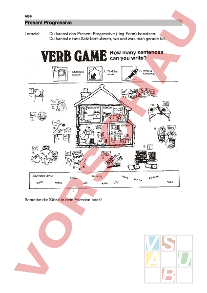AB8 Present Progressive Lernziel: Du kannst das Present Progressive (ingForm) benutzen. Du kannst einen Satz formulieren, wo und was man gerade tut. Schreibe die Sätze in dein Exercice book!