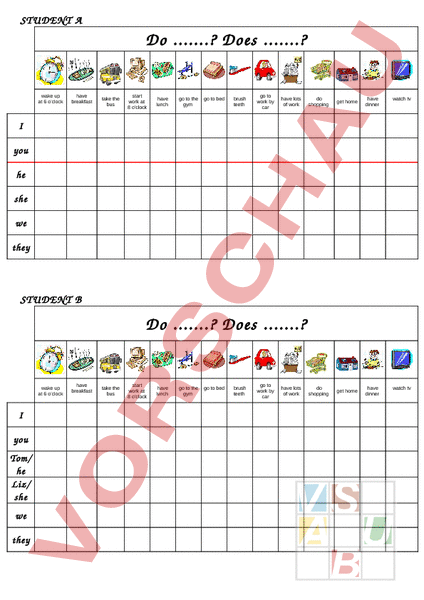 STUDENT Do .? Does .? wake up at 6 oclock have breakfast take the bus start work at 8 oclock have lunch go to the gym go to bed brush teeth go to work by car have lots of work do shopping get home have dinner watch tv do shopping get home have dinner watch tv you he she we they STUDENT Do .? Does .? wake up at 6 oclock you Tom/ he Liz/ she we they have breakfast take the bus start work at 8 oclock have lunch go to the gym go to bed brush teeth go to work by car have lots of work