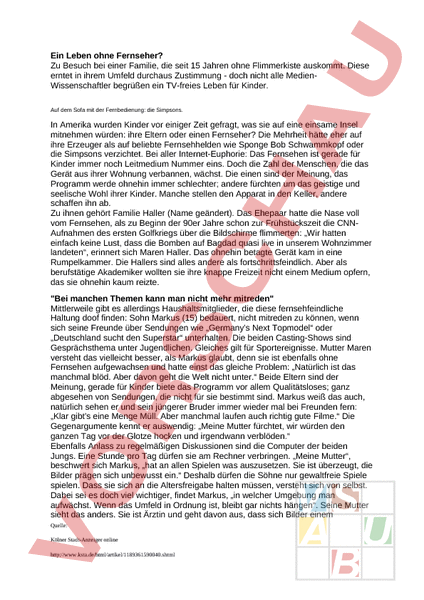 Ein Leben ohne Fernseher? Zu Besuch bei einer Familie, die seit 15 Jahren ohne Flimmerkiste auskommt. Diese erntet in ihrem Umfeld durchaus Zustimmung doch nicht alle MedienWissenschaftler begrüßen ein TV-freies Leben für Kinder. Auf dem Sofa mit der Fernbedienung: die Simpsons. In Amerika wurden Kinder vor einiger Zeit gefragt, was sie auf eine einsame Insel mitnehmen würden: ihre Eltern oder einen Fernseher? Die Mehrheit hätte eher auf ihre Erzeuger als auf beliebte Fernsehhelden wie Sponge Bob Schwammkopf oder die Simpsons verzichtet. Bei aller Internet-Euphorie: Das Fernsehen ist gerade für Kinder immer noch Leitmedium Nummer eins. Doch die Zahl der Menschen, die das Gerät aus ihrer Wohnung verbannen, wächst. Die einen sind der Meinung, das Programm werde ohnehin immer schlechter; andere fürchten um das geistige und seelische Wohl ihrer Kinder. Manche stellen den Apparat in den Keller, andere schaffen ihn ab. Zu ihnen gehört Familie Haller (Name geändert). Das Ehepaar hatte die Nase voll vom Fernsehen, als zu Beginn der 90er Jahre schon zur Frühstückszeit die CNNAufnahmen des ersten Golfkriegs über die Bildschirme flimmerten: „Wir hatten einfach keine Lust, dass die Bomben auf Bagdad quasi live in unserem Wohnzimmer landeten, erinnert sich Maren Haller. Das ohnehin betagte Gerät kam in eine Rumpelkammer. Die Hallers sind alles andere als fortschrittsfeindlich. Aber als berufstätige Akademiker wollten sie ihre knappe Freizeit nicht einem Medium opfern, das sie ohnehin kaum reizte. Bei manchen Themen kann man nicht mehr mitreden Mittlerweile gibt es allerdings Haushaltsmitglieder, die diese fernsehfeindliche Haltung doof finden: Sohn Markus (15) bedauert, nicht mitreden zu können, wenn sich seine Freunde über Sendungen wie „Germany Next Topmodel oder „Deutschland sucht den Superstar unterhalten. Die beiden Casting-Shows sind Gesprächsthema unter Jugendlichen. Gleiches gilt für Sportereignisse. Mutter Maren versteht das vielleicht besser, als Markus glaubt, denn sie ist ebenfalls ohne Fernsehen aufgewachsen und hatte einst das gleiche Problem: „Natürlich ist das manchmal blöd. Aber davon geht die Welt nicht unter. Beide Eltern sind der Meinung, gerade für Kinder biete das Programm vor allem Qualitätsloses; ganz abgesehen von Sendungen, die nicht für sie bestimmt sind. Markus weiß das auch, natürlich sehen er und sein jüngerer Bruder immer wieder mal bei Freunden fern: „Klar gibt eine Menge Müll. Aber manchmal laufen auch richtig gute Filme. Die Gegenargumente kennt er auswendig: „Meine Mutter fürchtet, wir würden den ganzen Tag vor der Glotze hocken und irgendwann verblöden. Ebenfalls Anlass zu regelmäßigen Diskussionen sind die Computer der beiden Jungs. Eine Stunde pro Tag dürfen sie am Rechner verbringen. „Meine Mutter, beschwert sich Markus, „hat an allen Spielen was auszusetzen. Sie ist überzeugt, die Bilder prägen sich unbewusst ein. Deshalb dürfen die Söhne nur gewaltfreie Spiele spielen. Dass sie sich an die Altersfreigabe halten müssen, versteht sich von selbst. Dabei sei es doch viel wichtiger, findet Markus, „in welcher Umgebung man aufwächst. Wenn das Umfeld in Ordnung ist, bleibt gar nichts hängen. Seine Mutter sieht das anders. Sie ist Ärztin und geht davon aus, dass sich Bilder einem Quelle: Kölner Stadt-Anzeiger online kindlichen Gedächtnis viel stärker einprägen als Texte: „Natürlich sind Märchen auch grausam, aber die Bilder, mit denen man sie zum Beispiel beim Vorlesen unwillkürlich illustriert, stammen aus der eigenen Fantasie. Die Gewalt aus dem Fernsehen oder der Computerspiele kann diese Vorstellungskraft aber bei Weitem übersteigen, und man kann sich ihnen selbst als junger Mensch nicht entziehen, weil man Bilder im Gegensatz zu Texten immer versteht. Das Ehepaar ist überzeugt, dass die Söhne dank einer Kindheit ohne Fernsehen gelernt hätten, ihre Freizeit aktiver zu gestalten. Viele Leute bewundern diese Familie Medienwissenschaftler betrachten diese Haltung dennoch mit Skepsis. Maya Götz, Leiterin des Internationalen Zentralinstituts für das Jugend- und Bildungsfernsehen (IZI, München), berichtet vom Beispiel eines Fünfjährigen, der ohne Fernsehen aufgewachsen ist: „Als Vater und Sohn in einem Mediensupermarkt waren, stand der Junge mit großen Augen vor einer Wand voller Fernseher, die einen »James Bond«Film zeigten. Anschließend litt er drei Monate unter Alpträumen. Der Vater habe das Ereignis als Beweis gewertet, wie schädlich das Fernsehen sei. Götz widerspricht: „Für mich ist das Erlebnis ein Zeichen von mangelndem Verantwortungsgefühl der Eltern. Natürlich kann man ein Leben ohne Fernsehen führen. Eltern muss aber klar sein, dass ihre Kinder dem Fernseher früher oder später zwangsläufig begegnen werden. Und wenn die Kinder nicht gelernt haben, damit umzugehen, sind sie überfordert. Die Medienwissenschaftlerin findet es sinnvoller, „das Kleinkind so lange vor Medien zu schützen, wie man es für richtig hält, und dann ganz gezielt und konsequent mit der Medienerziehung zu beginnen: bewusste Auswahl, gemeinsame unterstützende Rezeption und klare Begrenzung. Das gelte selbstverständlich für alle Medien: von Büchern über Fernsehen bis hin zum Computerspiel. Aber dann müssten Eltern irgendwann loslassen: „Mit zunehmendem Alter muss das Kind lernen, selber Verantwortung für sich zu tragen und mit der Faszination des Fernsehens umzugehen. Bernd Schorb (Lehrstuhl für Medienpädagogik an der Universität Leipzig) hält eine Entscheidung gegen das Fernsehen nur dann für sinnvoll, wenn sie einstimmig von der gesamten Familie geteilt wird. Das ist bei den Hallers eindeutig nicht der Fall: In den „Familienkonferenzen werden seit Jahren immer wieder dieselben Argumente gewechselt, aber die Eltern bleiben hart. Maren Haller steht dazu, dass die familiäre Demokratie in diesem Fall an ihre Grenzen stoße. Wenig Verständnis, erinnert sie sich, habe es anfangs 