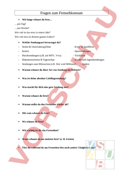 Fragen zum Fernsehkonsum • Wie lange schaust du fern pro Tag? pro Woche? Wie viel ist das etwa in einem Jahr? Wie viel etwa in deinem ganzen Leben? • Welche Sendungsart bevorzugst du? Serien Unterhaltungsfilme Kino- Spielfilme Krimis Sportsendungen Musiksendungen (z.B. auf MTV, Viva) Trickfilme Dokumentationen Tagesschau Kinder und Jugendsendungen Sendungen zum Mitmachen (z.B. Wer wird Millionär) • Warum schaust du diese Art von Sendung am liebsten? • Was ist deine absolute Lieblingssendung? • Was macht für dich eine gute Sendung aus? • Warum schaust du fern? • Warum stellst du den Fernseher wieder ab? • Mit wem schaust du fern? • Wo schaust du fern? • Wie wichtig ist dir das Fernsehen? • Wann schaust du am meisten fern? (z. B. Ferien) • Übst du während du am Fernsehen bist noch andere Tätigkeiten aus? Andere