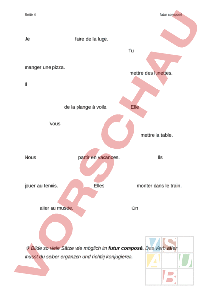 Unité 4 futur composé Je faire de la luge. Tu manger une pizza. mettre des lunettes. Il de la plange à voile. Elle Vous mettre la table. Nous jouer au tennis. aller au musée. partir en vacances. Ils Elles monter dans le train. On Bilde so viele Sätze wie möglich im futur composé. Das Verb aller musst du selber ergänzen und richtig konjugieren.