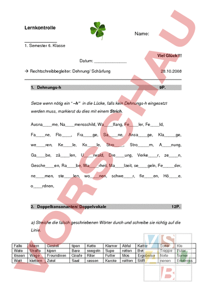 Lernkontrolle Name: 1. Semester 6. Klasse Viel Glück!!! Datum: Rechtschreibbegleiter: Dehnung/ Schärfung 28.10.2008 1. Dehnungsh 9P. Setze wenn nötig ein –h in die Lücke, falls kein Dehnungsh eingesetzt werden muss, markierst du dies mit einem Strich. Ausname, Namensschild, Walfang, Feler, Feld, Fane, Flo, weren, Kele, Gabe, zälen, Frage, Sane, Ansage, Kla_ge, Stro, Stro_m, Anung, Kole, Urwald, Dreung, Verker, zen, Gescheen, Rabe, Warheit, Malzeit, segeln, Fe_der, nemen, stelen, wonen, schwer, fleen, Höe, ordnen, 2. Doppelkonsonanten/ Doppelvokale 12P. a) Streiche die falsch geschriebenen Wörter durch und schreibe sie richtig auf die Linie. Falle Wate lössen Watt Mann Straffe Wage klettern Gestell kipen Freundinen Zetel tipen Bare Girafe Saal Kette seegeln Riter rassen Klamer Supe Futter Karote Abfal retten Mos reitten Katter Bet Ergebnise Stifft Tone Treppe Nefe nenen Kle Futer Somer Erlebniss b) Entscheide, ob du die Doppelvokale aa, ee, oo oder einzelne Vokale a, e, einsetzen musst, damit korrekte Wörter entstehen. M.r, gltt, Hr, Sl, W.tte, Pr, L.tte, W.ge, 3. Verdoppelung durch Pluralbildung Schreibe folgende Wörter mit entsprechendem Artikel in der Mehrzahlform auf. Einzahl (Singular) das Erlebnis die Kundin der Maler die Prinzessin das Zeugnis die Frau Mehrzahl (Plural) 3P. 4. Kleine Wörter 3P. Setze die Wörter im Kasten in die entsprechenden Lücken ein (es werden nicht alle Wörter gebraucht). ab, wenn, mit, ihm, im, das, dass, um, was, wen, an, vom, denn, den Fabio geht mit seinem Bruder immer ins Kino, . ein Action Film gezeigt wird. . beide sind grosse Fans . solchen Filmen. Die Mutter fragt: „ . gefällt euch denn an diesen Filmen? Die Söhne antworten: „Es ist toll, der Actionheld am Schluss gewinnt. „ welche Zeit beginnt der Film? „Um Acht Uhr. Beurteilung:P. 27 P. Datum: Unterschrift: