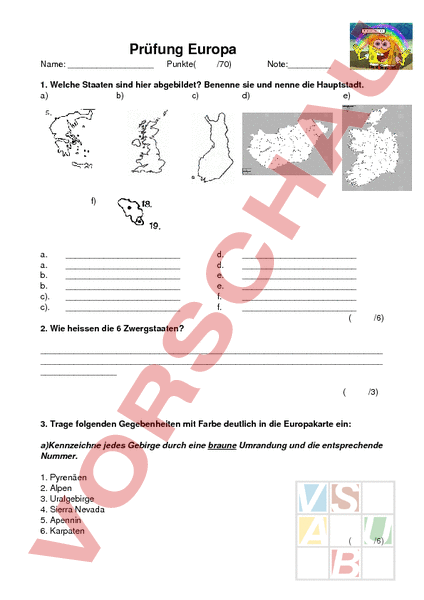 Prüfung Europa Name: Punkte( /70) Note:_ 1. Welche Staaten sind hier abgebildet? Benenne sie und nenne die Hauptstadt. a) b) c) d) e) f) a. a. b. b. c). c). d. d. e. e. f. f. /6) 2. Wie heissen die 6 Zwergstaaten? /3) 3. Trage folgenden Gegebenheiten mit Farbe deutlich in die Europakarte ein: a)Kennzeichne jedes Gebirge durch eine braune Umrandung und die entsprechende Nummer. 1. Pyrenäen 2. Alpen 3. Uralgebirge 4. Sierra Nevada 5. Apennin 6. Karpaten /6) b) Kennzeichne jeden Meeresteil durch eine entsprechende blaue Ziffer. 7. Atlantik 8. Kaspisches Meer 9. Ostsee 10. Mittelmeer 11. Ägäisches Meer 12. Schwarzes Meer 13. Adria 14. Ärmelkanal /8) 4. Benenne die markierten Flüsse. 1 6 8 7 4 5 2 3 1. 2. 3. 4. 5. 6. 7. 8. /8) 5. Länder und Hauptstädte Europas a) Teile den Ländern die richtige Nummer zu (124). Schweiz Portugal Deutschland Bosnien und Herzegowina Mazedonien Italien Norwegen Rumänien Belgien Tschechien Zypern Frankreich Holland Lettland Polen Albanien Österreich Estland Luxemburg Ungarn Irland Spanien Griechenland Grossbritannien /12) b) Nenne die Hauptstädte der 24 Staaten. 1. 11. 21. 2. 12. 22. 3. 13. 23. 4. 14. 24. 5. 15. 6. 16. 7. 17. 8. 18. 9. 19. 10. 20. /12) 6. Vervollständige folgenden Lückentext. 1. Spanien und Portugal bilden dieHalbinsel. 2. Der Dnjepr mündet in das. 3. Im Osten grenzt Europa angebirge. 4. Der Meeresteil zwischen Italien und Kroatien heisst. 5. Die Insel Kreta gehört zu. 6. Die Republik Andorra grenzt an und . 7. An der Themse liegen und . 8. Der Olymp befindet sich in. 9. Am Rhein liegen und. 10. Der Plattensee ist ein See in. 11. Die Bretagne und die Normandie sind Gebiete in . 12. Der Ätna ist ein Vulkan auf. 13. In welcher Stadt befinden sich das Land der tausend Seen?_ 14. In welcher Stadt steht das Brandenburger Tor? 15. In welcher Stadt findet man das Kolosseum? /15)