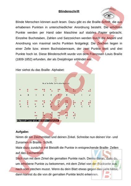 Informationen zur Braille Schrift und eine Aufgabe selbst etwas in Blindenschrift zu schreiben
