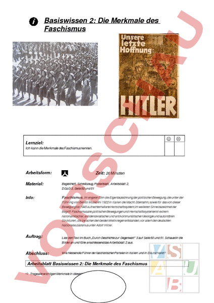 Merkmale des Faschismus. Auftrag aus einer Wekstatt über den 2. Weltkrieg. Die Sch. erarbeiten die Merkmale des Faschismus selbständig. Mit Lösungen