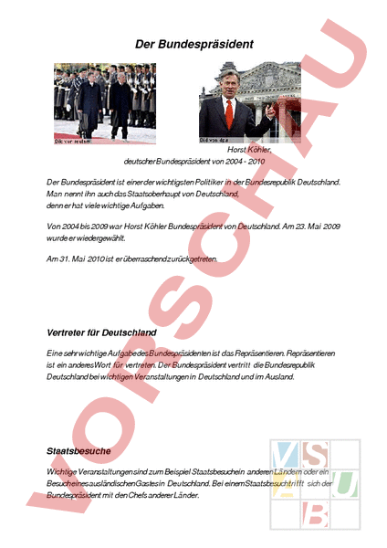 Der Bundespräsident Horst Köhler, deutscher Bundespräsident von 2004 2010 Der Bundespräsident ist einer der wichtigsten Politiker in der Bundesrepublik Deutschland. Man nennt ihn auch das Staatsoberhaupt von Deutschland, denn er hat viele wichtige Aufgaben. Von 2004 bis 2009 war Horst Köhler Bundespräsident von Deutschland. Am 23. Mai 2009 wurde er wiedergewählt. Am 31. Mai 2010 ist er überraschendzurückgetreten. Vertreter für Deutschland Eine sehr wichtige Aufgabe desBundespräsidenten ist das Repräsentieren. Repräsentieren ist ein anderesWort für vertreten. Der Bundespräsident vertritt die Bundesrepublik Deutschland bei wichtigen Veranstaltungen in Deutschland und im Ausland. Staatsbesuche Wichtige Veranstaltungen sind zum Beispiel Staatsbesuchein anderen Ländern oder ein Besuch einesausländischenGastesin Deutschland. Bei einemStaatsbesuchtrifft sich der Bundespräsident mit den Chefs anderer Länder. Wenn wichtige Politiker aus demAusland nach Deutschland kommen, trifft sich der Bundespräsident hier mit ihnen. Manchmal zeigt er seinemBesuch dann Dinge, auf die Deutschland stolz ist. Das kann zum Beispiel ein Museum sein oder ein wichtiges Denkmal. Verträge unterschreiben Der Bundespräsident hat noch anderewichtige Dinge zu tun. Im Namen der Bundesregierung unterschreibt er zum Beispiel Verträge mit anderen Staaten. In so einem Vertrag vereinbaren zwei Länder bestimmte Dinge miteinander. Mit seiner Unterschrift gibt der Bundespräsident das Versprechen, dassDeutschland sich an dieseVerträge halten wird. Gefangene begnadigen Außerdemkann der Bundespräsident dafür sorgen, dassMenschen, die schon sehr lange im Gefängnis gesessenhaben, freigelassenwerden. Das nennt man begnadigen. Gesetze prüfen Der Bundespräsident hat auch die Aufgabe, Gesetzezu prüfen. Wenn die Politiker im Bundestag und im Bundesrat ein neuesGesetz beschlossenhaben, wird esdem Bundespräsidenten vorgelegt. Er mussesgründlich lesen und unterschreiben, wenn er denkt, dassdie Politiker bei dem Gesetz alles richtig gemacht haben. Denn erst, wenn ein Gesetz vom Bundespräsidenten unterschrieben wurde, ist esauch gültig. Bundeskanzler ernennen Der Bundespräsident ernennt außerdemden Bundeskanzler. Das heißt aber nicht, dasser den Bundeskanzler selbst aussuchendarf. Wer Bundeskanzler wird, schlägt die Partei vor, die bei der Bundestagswahl die meisten Stimmen bekommenhat. Dann wird im Bundestag gewählt. Wer die meisten Stimmen erhält, wird Bundeskanzler. Derjenige oder diejenigegeht dann zum Bundespräsidenten und wird von ihm ganz feierlich zum Bundeskanzler ernannt. Genausofunktioniert das mit den Bundesministern, also den Politikern, die ganz eng mit demBundeskanzler in der Regierung zusammenarbeiten. Die Wahl des Bundespräsidenten In Deutschland wird der Bundespräsident alle fünf Jahre gewählt. Dazu kommt die Bundesversammlung zusammen. Die Wahl desBundespräsidenten ist die einzige Aufgabe der Bundesversammlung. Wer ist in der Bundesversammlung? In der Bundesversammlung sind alle Politikerinnen und Politiker aus dem Bundestag und noch mal genausoviele Mitglieder aus den 16 deutschen Bundesländern. Die Vertreter der Bundesländer müssennicht unbedingt Politiker sein, auch Spitzensportler oder andere berühmte Leute dürfen in der Bundesversammlung mitwählen. Schloss Bellevue Der Bundespräsident hat seinen Arbeitsplatz im SchlossBellevue in Berlin. Spätestensnach zehn Jahren musser allerdings ausziehen. Der Bundespräsident darf nämlich nur ein Mal wiedergewählt werden. Wer kann Bundespräsident werden? Jeder Deutschekann Bundespräsident werden. Er oder sie mussmindestens40 Jahre alt sein und von einemMitglied der Bundesversammlung zur Wahl vorgeschlagenwerden. Der Bundespräsident darf während seiner Amtszeit nur Präsident sein und keinen anderen Beruf ausüben. Außerdemdarf er kein Politiker aus der Bundesregierung oder aus einer Landesregierung sein.