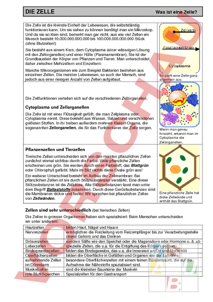 DIE ZELLE Was ist eine Zelle? Die Zelle ist die kleinste Einheit der Lebewesen, die selbstständig funktionieren kann. Um sie sehen zu können benötigt man ein Mikroskop. Und da sie so klein sind, bemerkt man gar nicht, aus wie viel Zellen ein Mensch besteht:10.000.000.000.000 bis 100.000.000.000.000 Stück (ohne Blutzellen!) Sie besteht aus einem Kern, dem Cytoplasma (einer wässrigen Lösung mit den Zellorganellen) und einer Hülle (Plasmamembran). Sie ist der Grundbaustein der Körper von Pflanzen und Tieren. Man unterscheidet daher zwischen Mehrzellern und Einzellern: Manche Mikroorganismen wie zum Beispiel Bakterien bestehen aus einzelnen Zellen. Die meisten Lebewesen, so auch der Mensch, sind jedoch aus einer riesigen Anzahl von Zellen aufgebaut. So sieht eine Zelle ganz allgemein aus. Die Zellfunktionen verteilen sich auf die verschiedenen Zellorganellen. Cytoplasma und Zellorganellen Die Zelle ist mit einer Flüssigkeit gefüllt, die man Zellplasma oder Cytoplasma nennt. Diese besteht aus Wasser, Salzen und verschiedenen gelösten Stoffen. In ihr treiben außerdem mehrere Kleinst-Organe, die sogenannten Zellorganellen, die für das Funktionieren der Zelle sorgen. Wenn man genau hinsieht, erkennt man im Cytoplasma die Zellorganellen. Pflanzenzellen und Tierzellen Tierische Zellen unterscheiden sich von den meisten pflanzlichen Zellen zunächst einmal sichtbar durch die Farbe: Viele pflanzliche Zellen erscheinen uns grün. Sie werden durch einen Farbstoff, das Blattgrün oder Chlorophyll gefärbt. Male im Bild rechts diese Ovale grün aus! Ein weiterer Unterschied besteht im Aufbau der Zellmembran: Bei pflanzlichen Zellen ist sie durch Stützsubstanzen verstärkt. Eine dieser Stützsubstanzen ist die Zellulose. Alle Stützsubstanzen fasst man unter dem Begriff Ballaststoffe zusammen. Durch diese Gerüstsubstanzen sind die Membranen dicker und fester: Wir sprechen bei pflanzlichen Zellen von Zellwänden. Eine pflanzliche Zelle hat dicke Zellwände und enthält das Blattgrün. Zellen sind sehr unterschiedlich (bei tierischen Zellen) Die Zellen in grossen Organismen haben sich spezialisiert: Beim Menschen unterscheiden wir unter anderem: Hautzellen Nervenzellen Drüsenzellen Leberzellen Bindegewebszellen Oberflächenzellen aufnehmende Zellen im Dünndarm Muskelzellen rote Blutkörperchen bilden Haut, Nägel und Haare ermöglichen die Reizleitung vom Reizempfänger bis zur Verarbeitungsstelle (meist Gehirn) und das Denken sondern Säfte wie den Speichel oder die Magensäure oder Hormone u. ä. ab spezielle Zellen, die u.a. für die Entgiftung des Körpers sorgen. bilden das Bindegewebe, das u.a. die Innereien an Ort und Stelle hält bilden die Oberfläche in Gefäßen und Organen wie der Luftröhre besondere Oberflächenzellen mit einem feinen Bürstensaum, die auf die Aufnahme der Nährstoffe spezialisiert sind. sind die kleinsten Bausteine der Muskeln Spezialzellen für den Gastransport